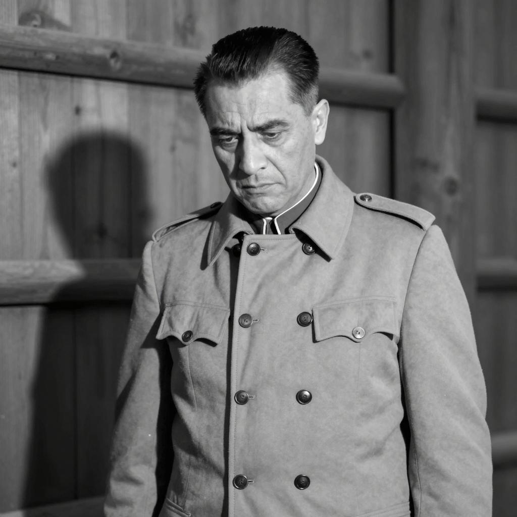 Black and white photograph of a middle-aged man with dark, neatly combed hair wearing a light-colored, buttoned military-style coat with shoulder epaulettes. The man exhibits a serious expression while looking downward. The wooden plank and vertical beam background adds a rustic atmosphere. Shadow of an indistinct figure is visible on the left side of the frame.