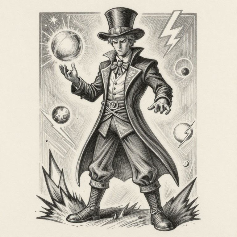 Ink linocut print of a arrogant teenage magician surrounded by magic orb and lightning, RPG Character, winter grayscale, pencil drawing, RPG old schoolrender,