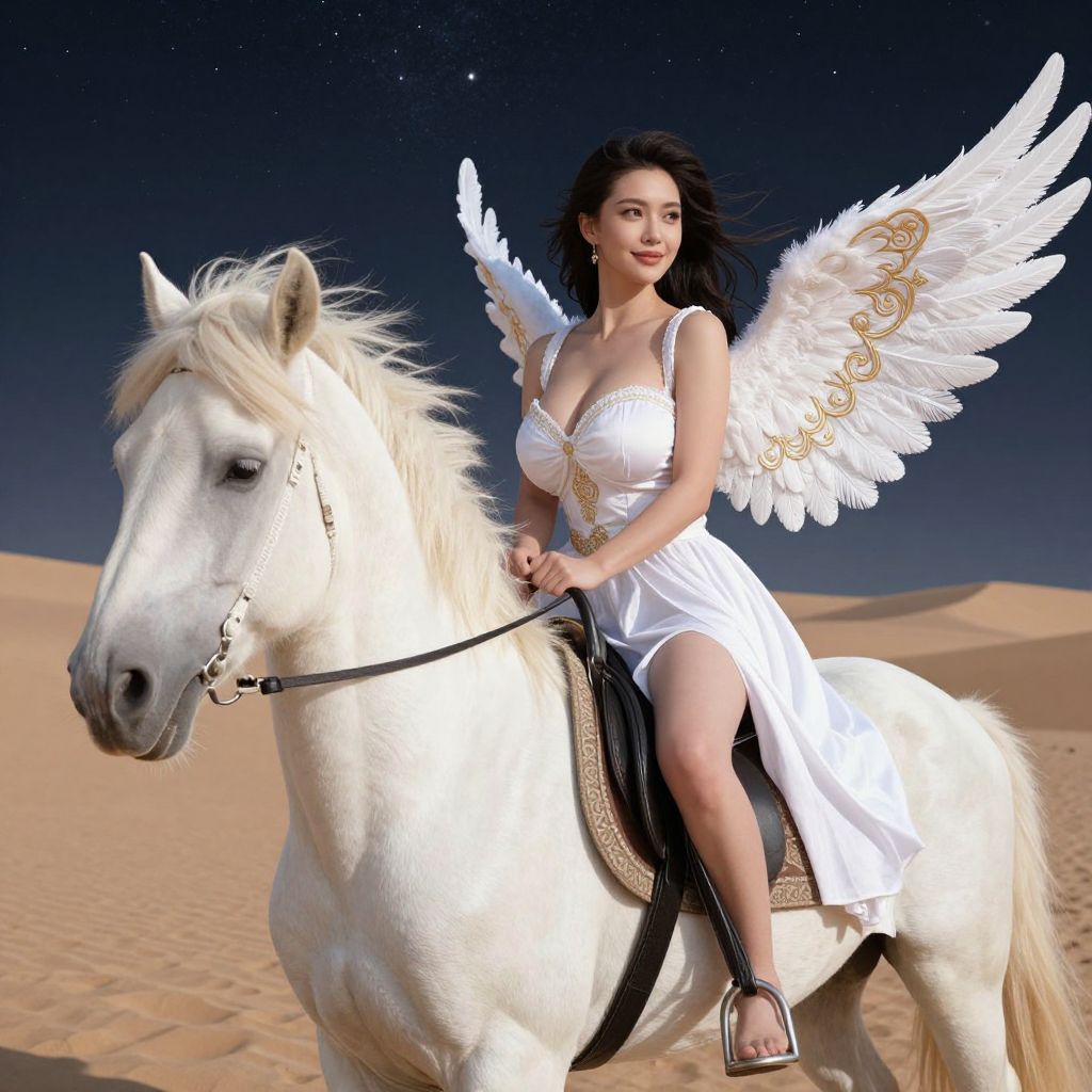 CGI image depicting a beautiful, young Asian woman with long black hair, riding a white horse in a desert at night. She has large, white, feathered wings with golden accents, and is wearing a flowing, white, sleeveless dress with a deep V-neck that reveals her cleavage. The horse is adorned with a black saddle and harness, and has a white mane and tail. The background features starry skies and sandy dunes. The woman's expression is serene, and she holds the reins firmly, with one leg slightly raised. The image has a fantasy, ethereal quality.