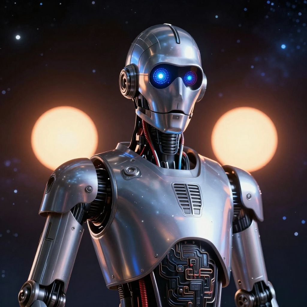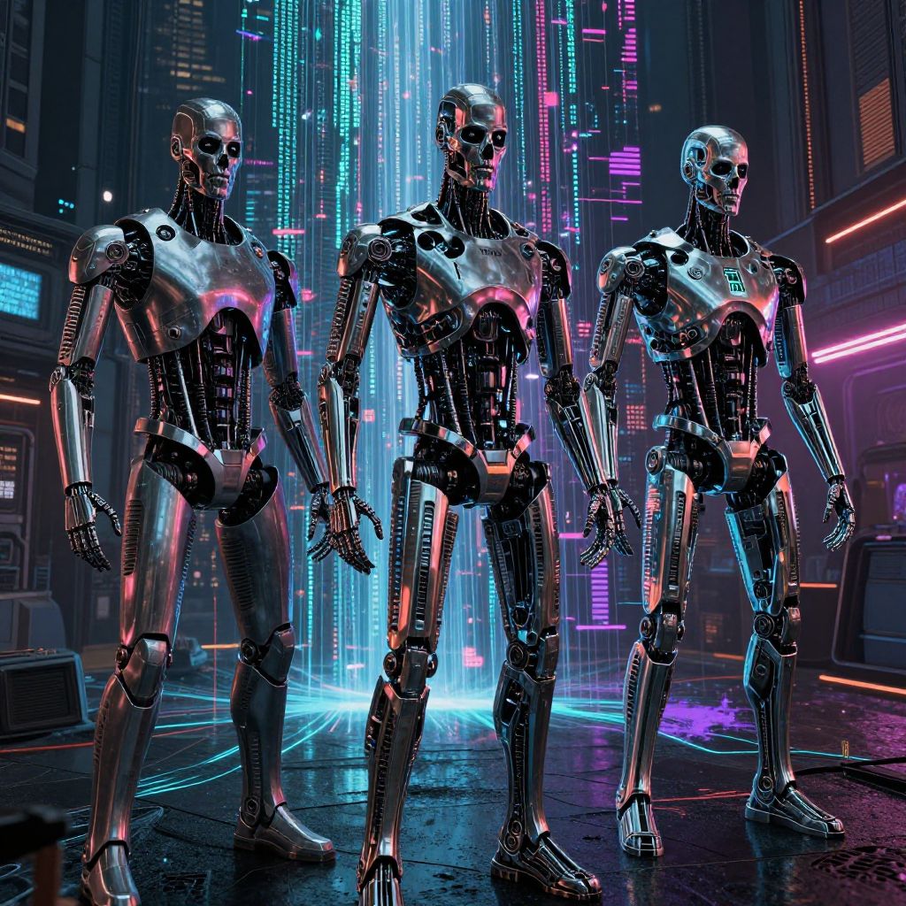 Photograph of three metallic robots with blue glowing eyes, standing in a narrow, urban street. Robots are gold, silver, and a mix, with