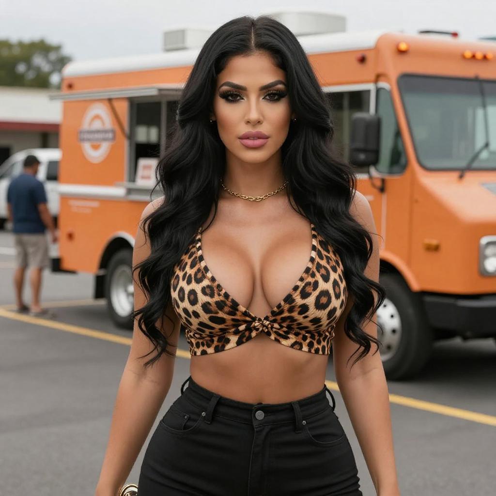 Photograph of a confident woman with long, wavy black hair and tan skin, wearing a low-cut, leopard-print crop top that reveals ample cleavage, and high-waisted black pants. She's standing in a parking lot with an orange food truck and blurred people in the background. She has a serious expression, and her makeup is bold with dark eyeliner and pink lips. She's wearing a gold necklace.