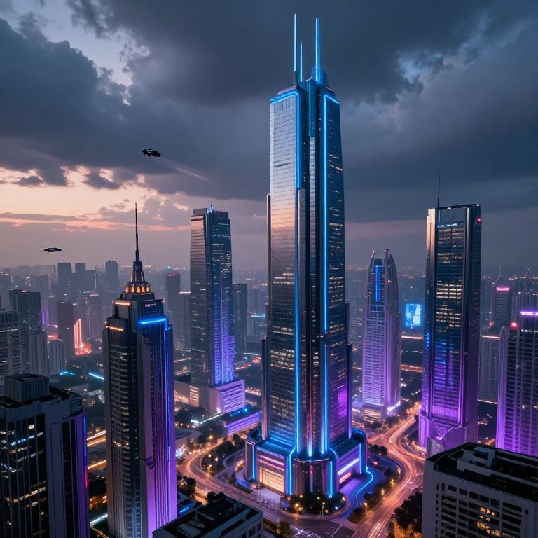 550 futuristic skyscrapers towering over a neon-lit cyberpunk cityscape at dusk, intricate architecture with glowing blue and purple lights, flying cars zooming between buildings under a stormy sky, high detail, vibrant colors