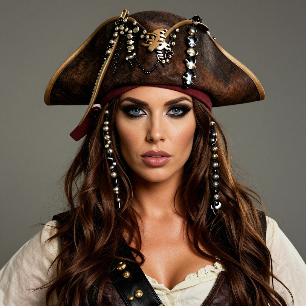 Woman pirate costume, solo, 1girl, hat, long hair, pirate, brown hair, blue eyes, upper body, looking at viewer, lips, drill hair, jewelry