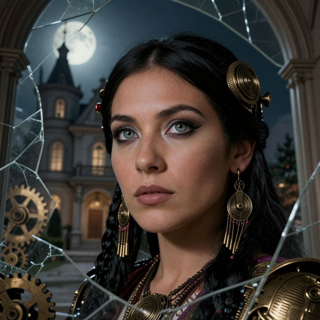 Photorealistic digital artwork of a young woman with fair skin, blue eyes, and dark braided hair adorned with gold accessories and red beads. She wears intricate gold earrings and a necklace with a metallic sheen, and her makeup includes dark eye shadow. Behind her, a gothic-style mansion is illuminated by a full moon in a dark night sky. The foreground features shattered glass with visible cracks and gold gears, adding a steampunk aesthetic. She gazes directly at the viewer with a serious expression. The overall color palette includes dark blues, golds, and muted earth tones.