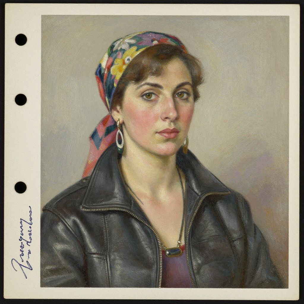 Realistic oil painting of a young woman with light skin, brown eyes, wearing a colorful headscarf, black leather jacket, necklace, and earrings
