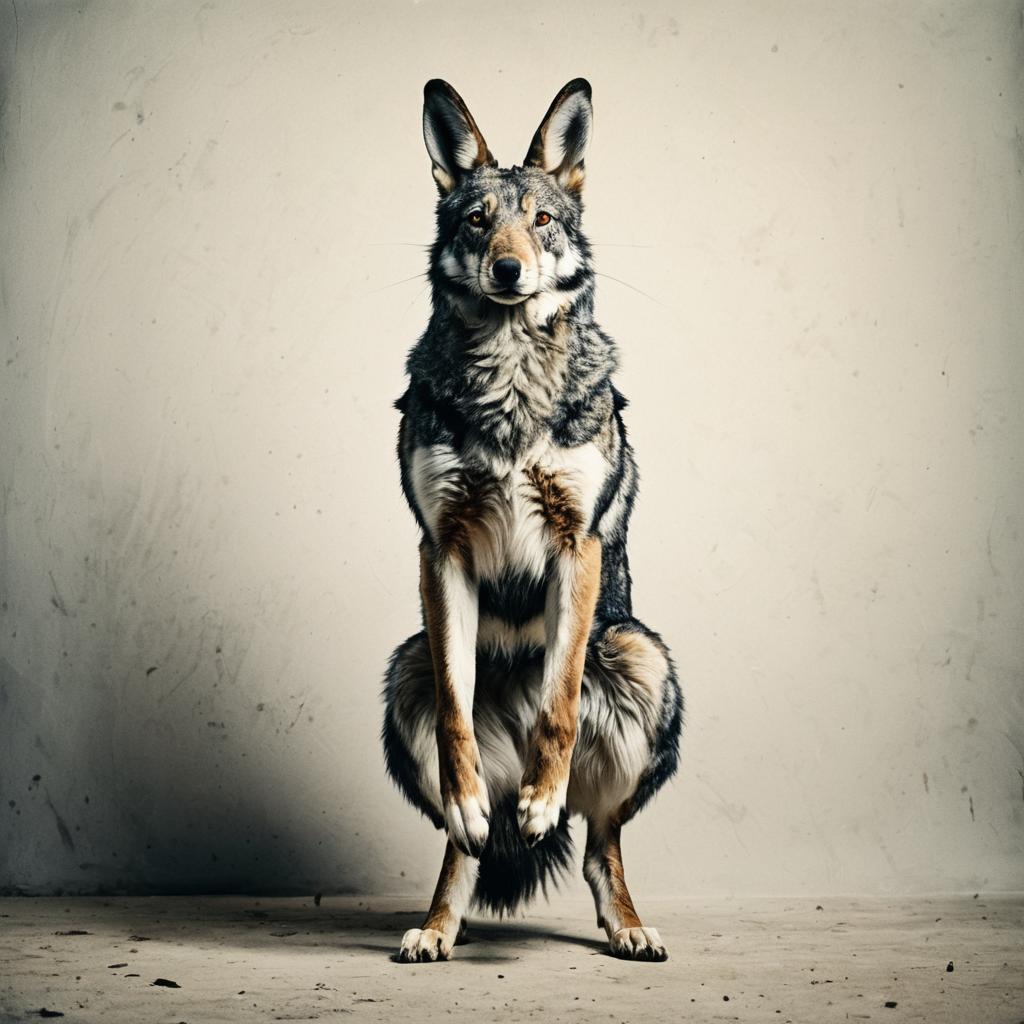 Full-body portrait of a tiger-eagle hybrid, with striped fur, a feathered tail, and standing on two legs, blending realism with artistic imagination in a surreal composition.