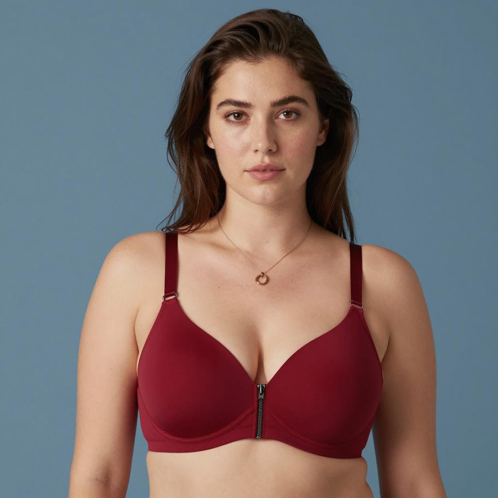 Photograph of a smiling Asian woman with long black hair, wearing a red bra. She stands against a plain white background, with her right hand touching her hair. Her bra is underwired and she has light skin. She is looking slightly to the right with her mouth open, showing teeth.