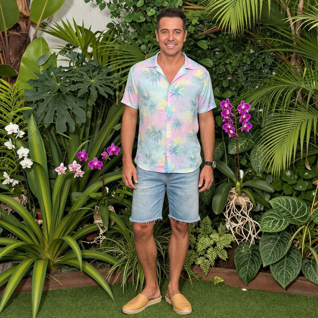 Photograph of a middle-aged man standing in a lush, tropical forest. He has short black hair, a medium build, and light skin. He wears a bright, short-sleeved polo shirt with a vibrant orange and blue palm leaf pattern, paired with white cargo pants and beige sneakers. He has a silver watch on his left wrist. The background is dense with green ferns, tall plants, and colorful flowers, including purple and yellow orchids. The forest floor is covered in dark, damp soil and leaves. The man stands slightly to the right, looking directly at the camera with a neutral expression.