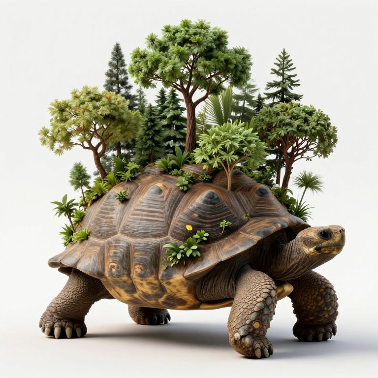 A colossal tortoise carries a thriving forest upon its shell, where miniature trees and lush greenery flourish in defiance of gravity, creating a surreal microcosm of life.