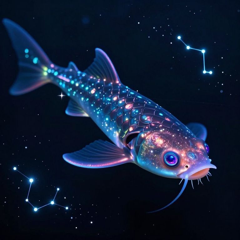 Bioluminescent constellations shimmer across the elongated body of a cosmic catfish, its iridescent scales reflecting starlight while galaxies twirl within its vivid, otherworldly eyes.