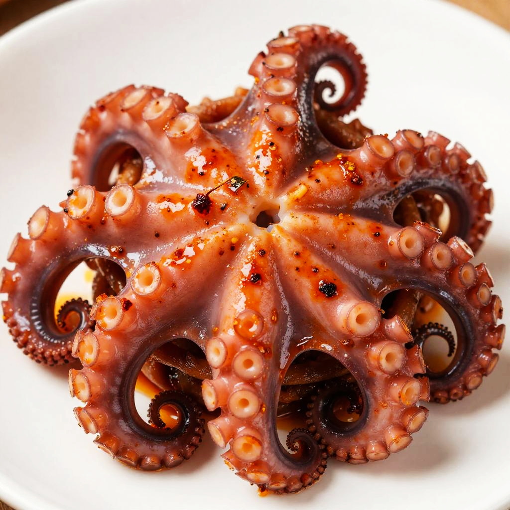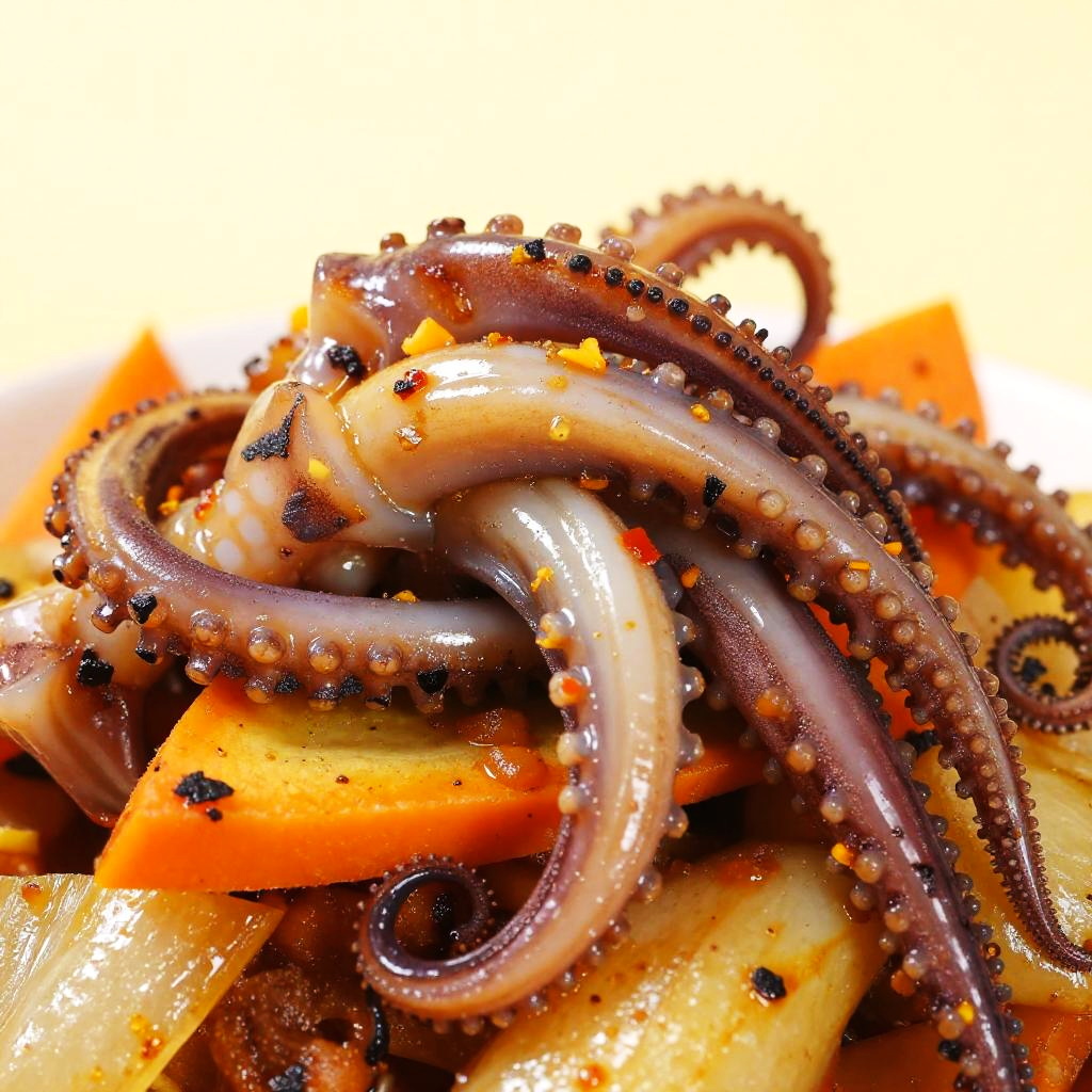 This close-up photo shows a vibrant, colorful dish featuring deep purple, semi-translucent squid tentacles with orange and red spices. The tentacles are piled over yellow and orange chunks of vegetables, possibly carrots and onions. The textures are glossy and slightly charred, with a mix of juicy and crispy elements. The background is a bright, creamy yellow, making the dish pop.
