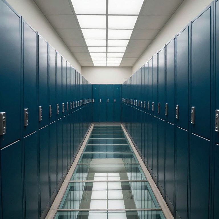 Symmetrical rows of dark teal lockers extend infinitely, flanking a central glass walkway that converges toward a luminous skylight overhead, creating an illusion of depth and endless repetition.