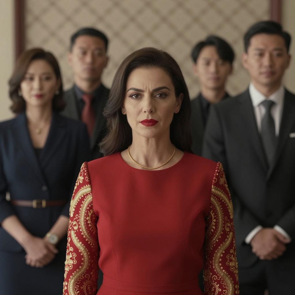 Photograph of a middle-aged woman with short curly brown hair wearing a white headscarf and a gray button-up shirt, looking upward with a concerned expression. She is surrounded by a diverse group of people, some wearing headscarves, in a dimly lit indoor setting. The background features blurred figures and soft lighting, emphasizing the woman's emotional focus.