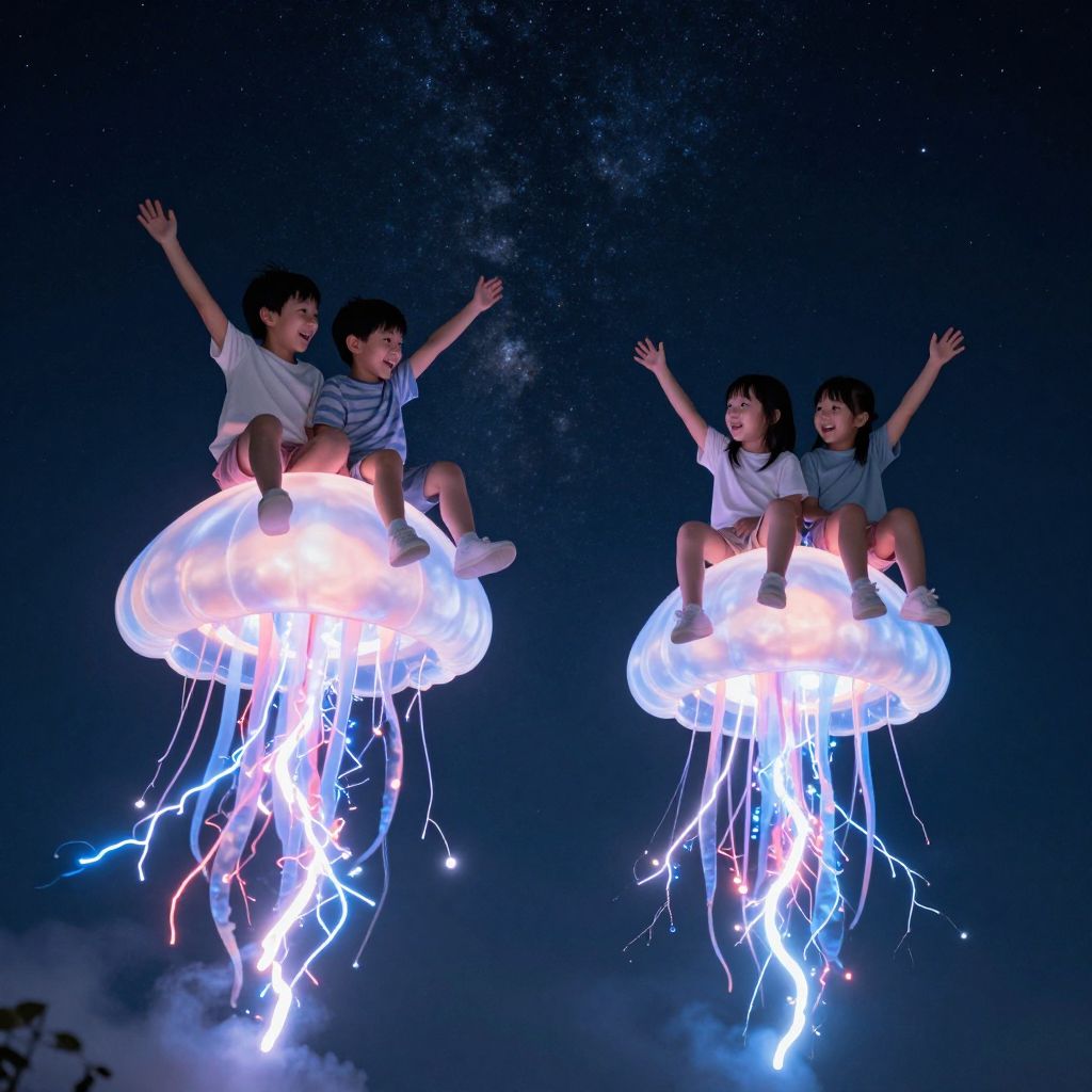 Photograph of two Asian children, one boy and one girl, joyfully floating on glowing jellyfish in a dark, starry night sky.