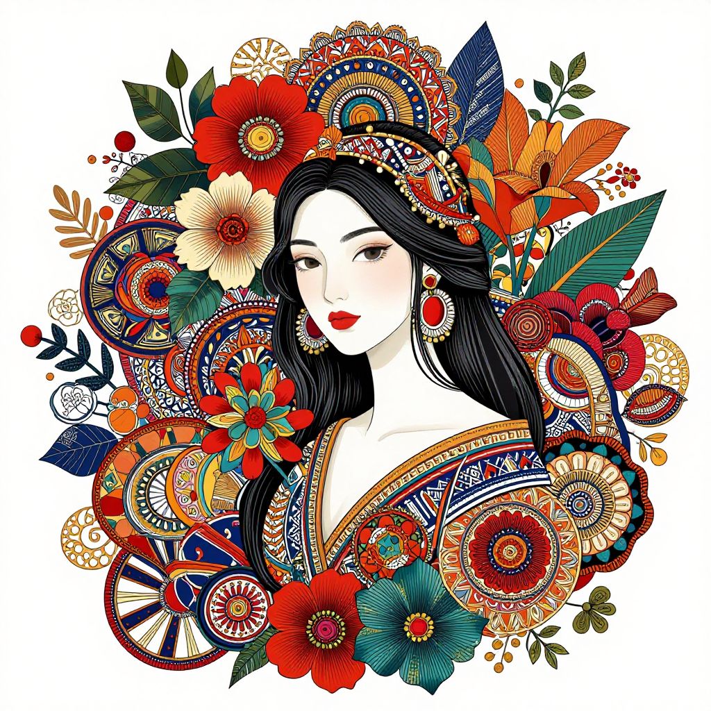Vibrant digital illustration of a fair-skinned woman with long black hair, adorned with colorful, intricate floral patterns and surrounded by vivid flowers and leaves