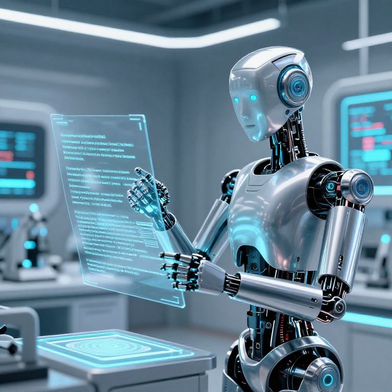 Digital CGI image of a shiny, blue-accented humanoid robot reading text on a holographic screen in a futuristic laboratory.
