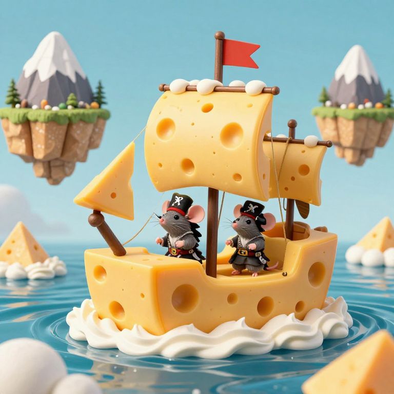 Mice in pirate attire sail a ship made entirely of cheese through an ocean of whipped cream, bypassing floating islands of gruyère mountains.