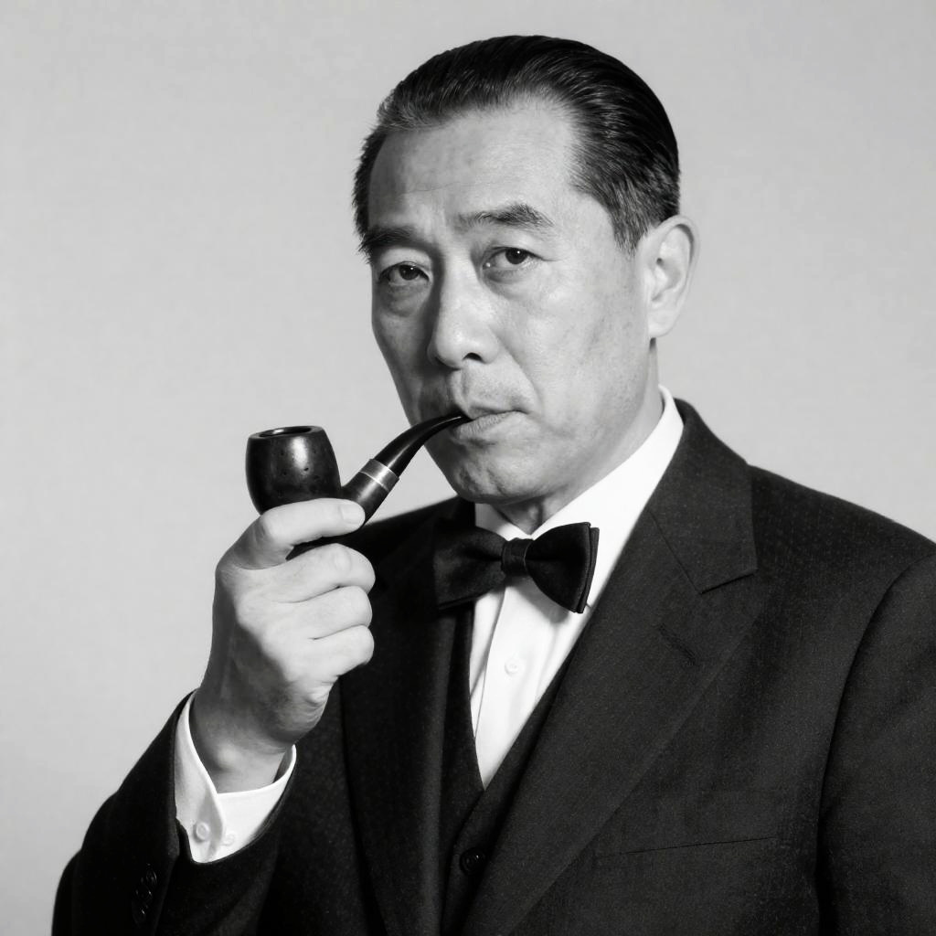 Black and white photograph of a middle-aged man with short hair, a cigarette in his mouth, and a slight smile. He wears a dark suit, looking directly at the camera. Background is plain white.