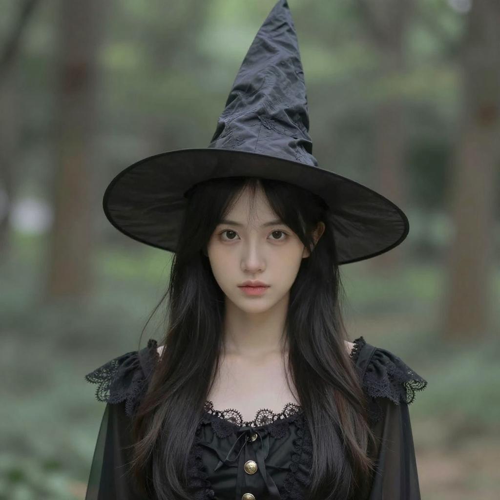 A woman with long platinum blonde hair wearing a handmade black witch costume is portrayed in a close-up portrait. She wears a traditional pointed witch hat with a buckle, complemented by a black outfit featuring decorative buttons and a belt strap, set against a textured neutral background.