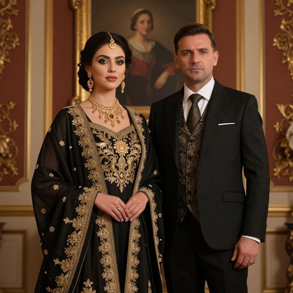 Elegantly dressed woman in ornate black attire adorned with gold embroidery and jewelry stands prominently in the foreground, while a formally attired man in a dark suit and patterned vest stands slightly behind her, both positioned against a backdrop featuring a framed portrait and richly decorated walls.