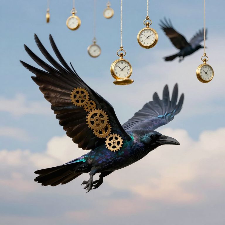 Iridescent crows soar gracefully against a surreal sky, their outstretched wings adorned with intricate gears, while numerous golden pocket watches dangle from strings above, creating a mesmerizing blend of time and flight.