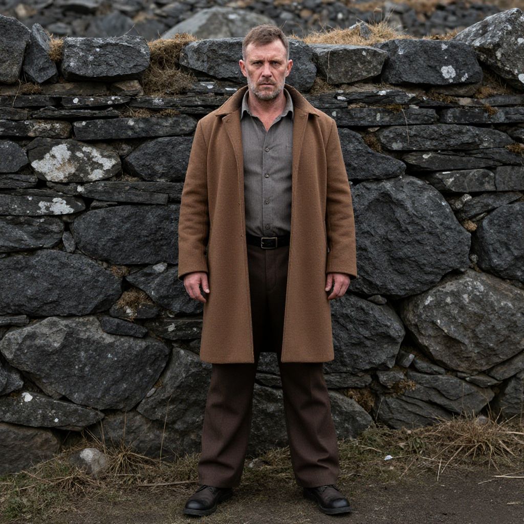 Photograph of a middle-aged Caucasian man with short brown hair and a beard, standing in front of a dark, weathered stone wall. He wears a brown, long, woolen coat over a gray button-up shirt and dark brown pants, with black shoes. His expression is serious and he stands with his hands by his sides. The background includes patches of grass and a rocky, uneven ground. The overall color palette is earthy and muted, with the brown coat and gray shirt contrasting against the dark, textured stone wall. The image has a natural, outdoor setting.