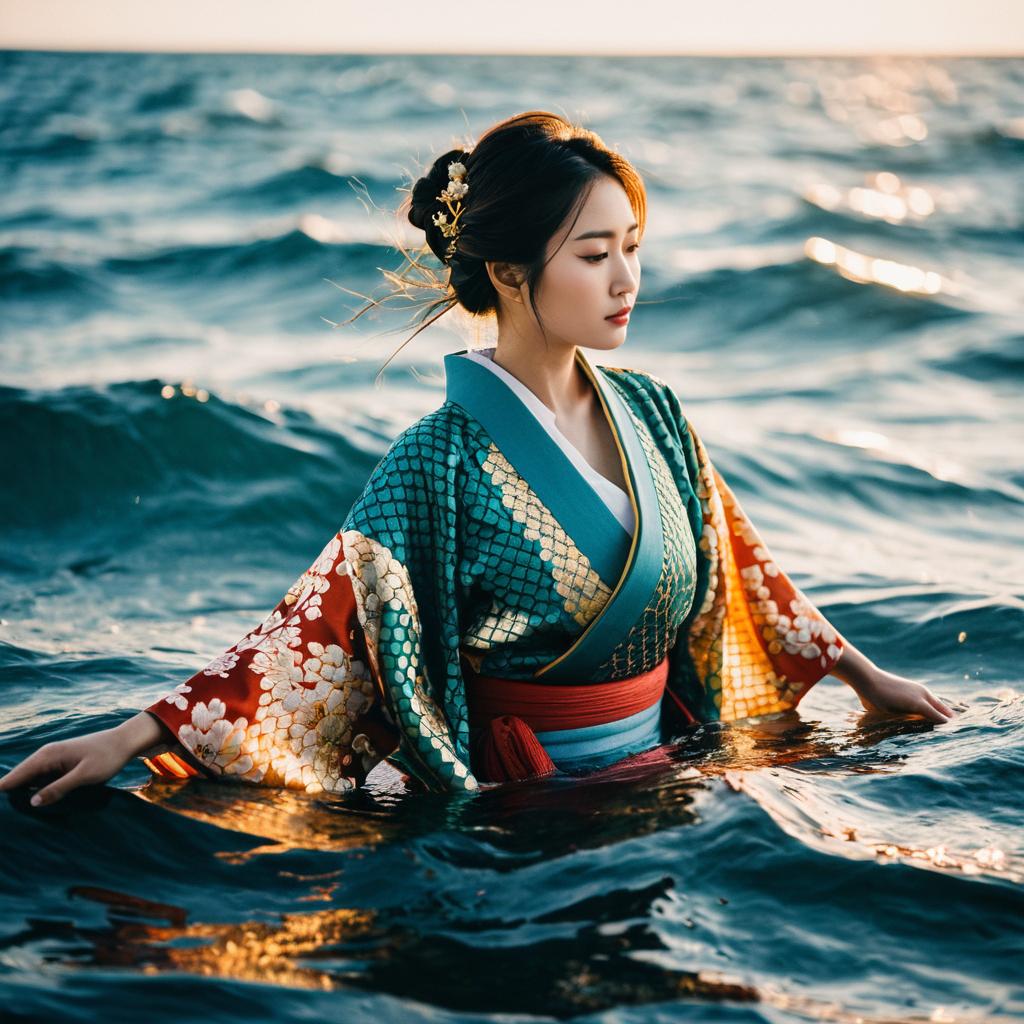 Color Scheme reek super model,she is in the ocean,scales,sunshine,shine,floating,celestial,moment, she dreeses japanese kimono,natural 35mm F4 photo,award winning photography, photorealistic, highly detailed, sharp, beautiful bokeh, beautifully color graded, accent lighting, sharp, high resolution, 8K,