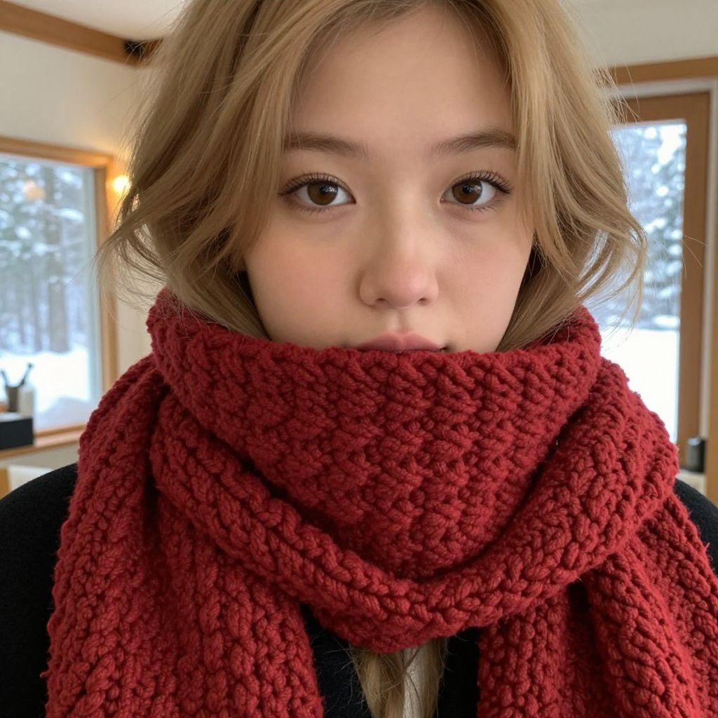 A close-up realistic photography of a young woman with warm brown eyes and soft blonde hair wearing a chunky red wool scarf wrapped around her neck, the scarf has a textured, knitted pattern with visible loops and thick stitches, set against a cozy winter interior with warm lighting and a window showing snowy scenery outside.