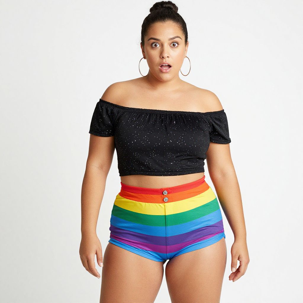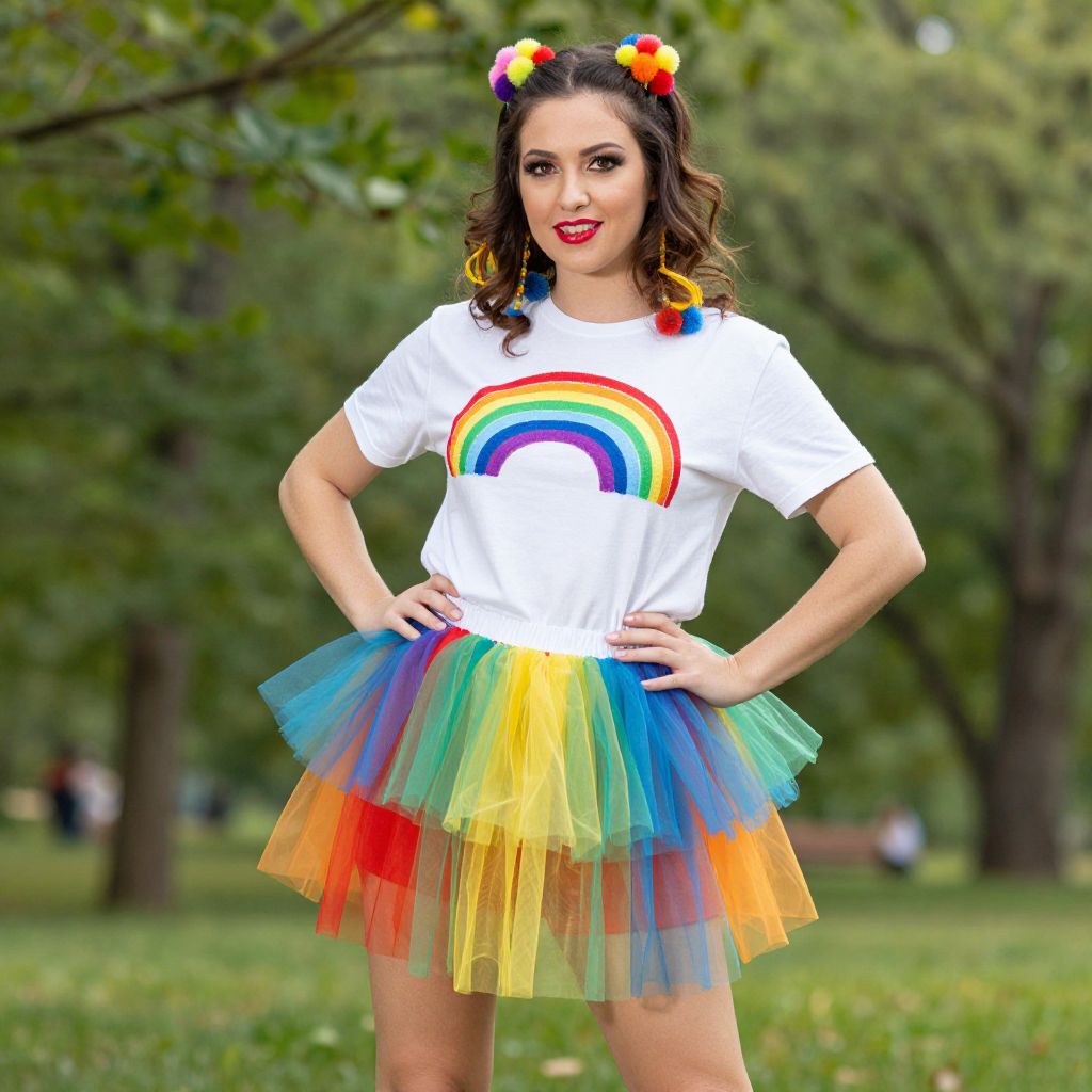Woman wearing a vibrant DIY Rainbow Brite costume featuring a white T-shirt with a colorful rainbow graphic, paired with a layered rainbow tutu skirt, accessorized with multicolored pom-pom hair clips, and posing confidently outdoors in a lush green park setting.