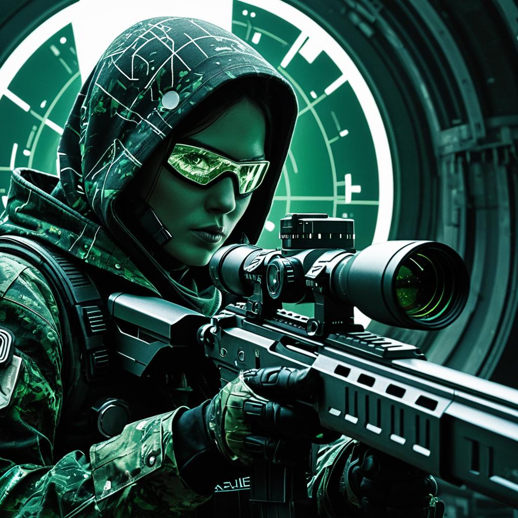 Close-up portrait of a synthetic android sniper wearing a dark green camouflaged hood and tactical gear, aiming through a high-tech sniper rifle scope. The android has glowing reticle-like eyes visible through reflective goggles, set against a futuristic, dystopian background with circular illuminated patterns. The scene is rendered in limited colors with an emphasis on dark green and silver tones, showcasing ultra-detailed and atmospheric sci-fi elements.