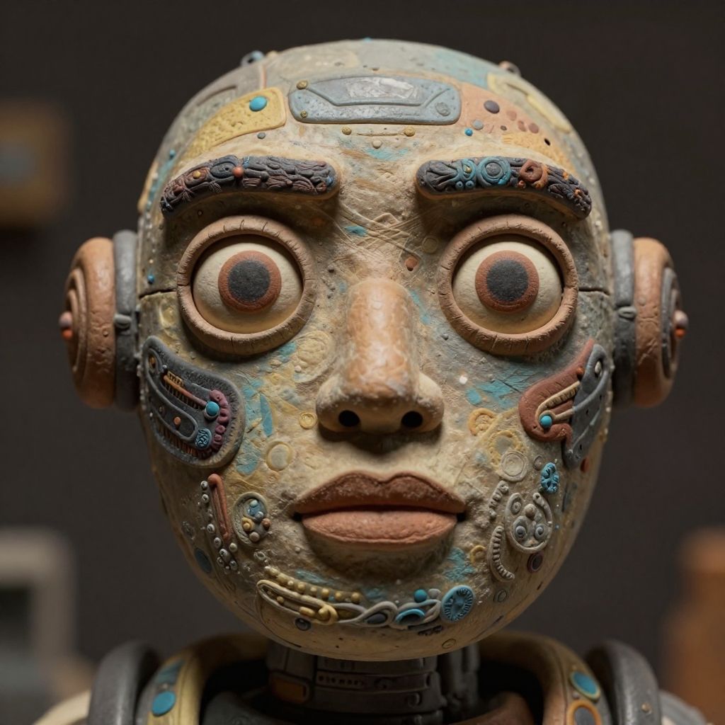 Claymation sculpture, highly detailed photograph of, ancient robot tempest, highly detailed diorama, realistic materials, felt lips, sharp focus, 85mm lens, f1.8 aperture, laika studios, cinematic lighting, 4k, symmetrical eyes, intricately detailed, extremely detailed, uhd, octane render, cinematic