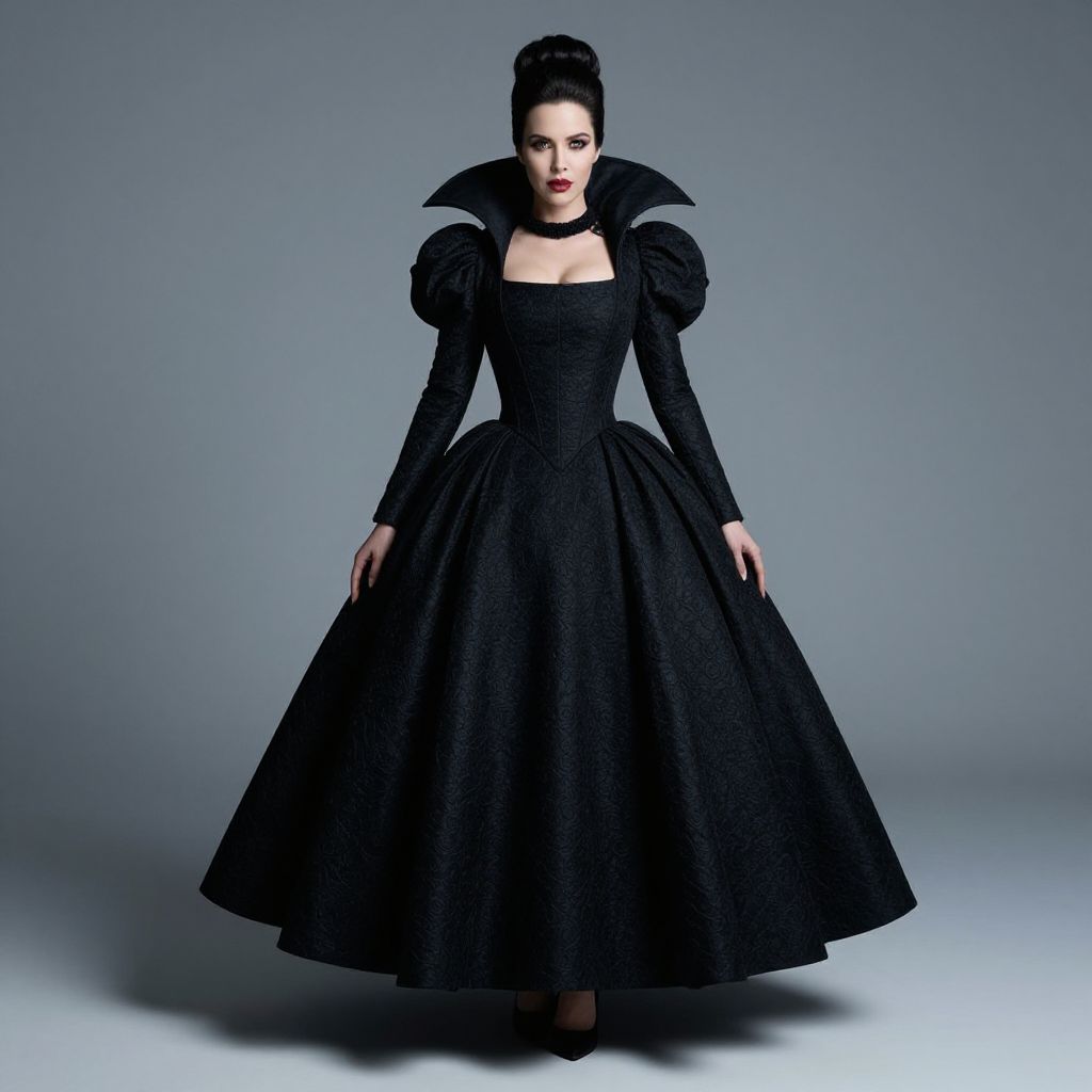 "Wicked Queen Dress, image of a woman in a black dress with a large collar"
