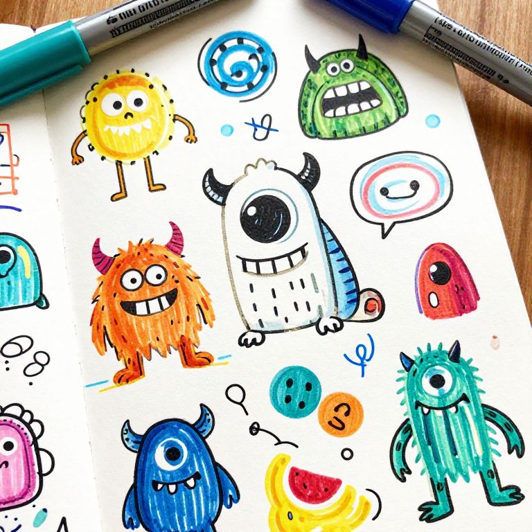 Handcraft scene showing a doodle prompt generator on paper with colorful markers and scribbles all around, creative chaos of sketches, funny monsters, and random shapes emerging from the page, natural lighting, vibrant and energetic atmosphere