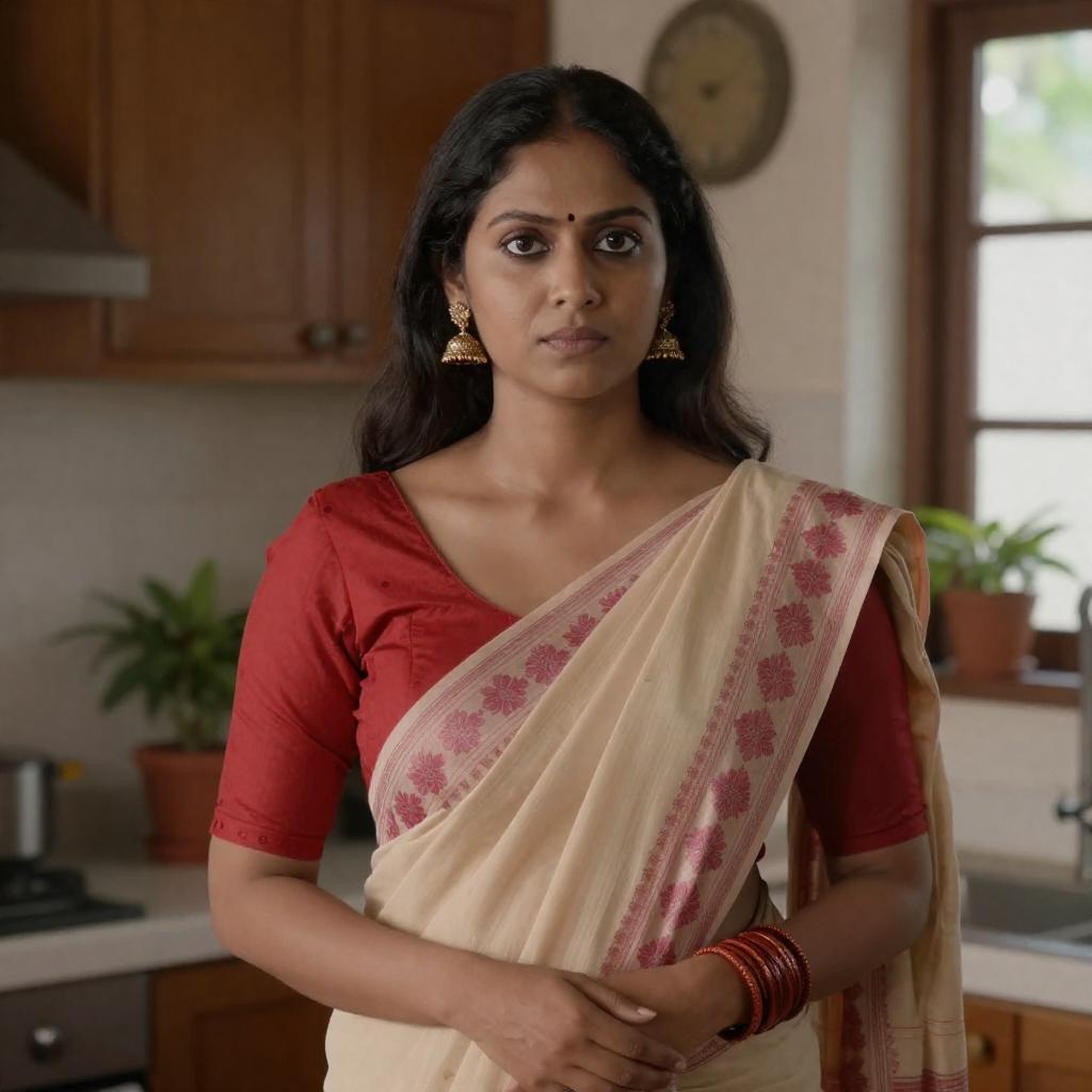 Indian woman in a turquoise saree with pink floral patterns walks confidently down a busy city street. She has dark hair, a brown handbag, and an intense expression. Six people walk in the background, wearing casual clothing. American flag and buildings line the street. Yellow taxi in the distance. Bright daylight.