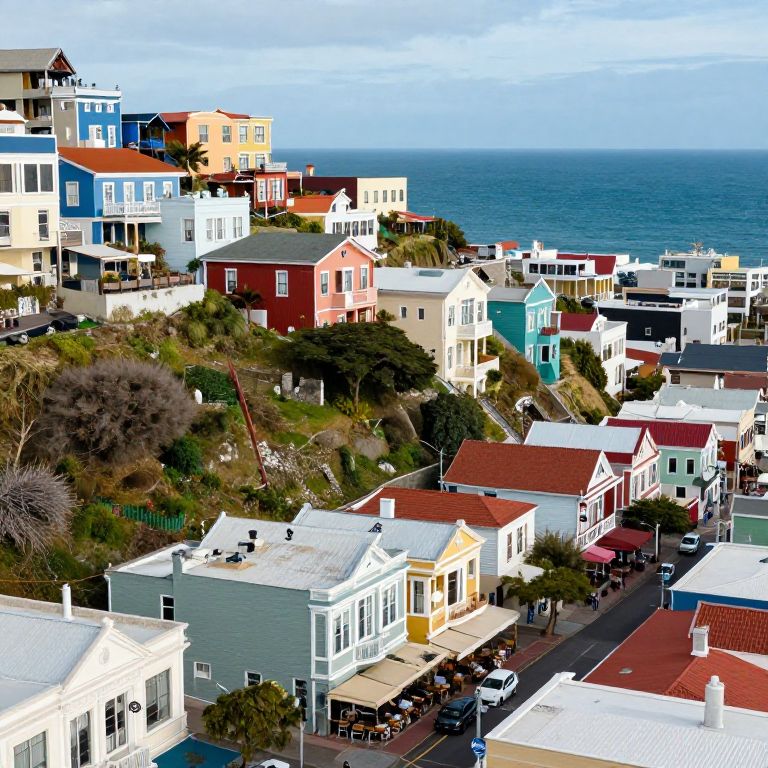 Valparaiso aerial view showcasing vibrant urban landscape, multicolored houses stacked on hills, Pacific Ocean in the background, dynamic street scenes with cafes and pedestrians, rich textures and detailed architecture, photorealistic style