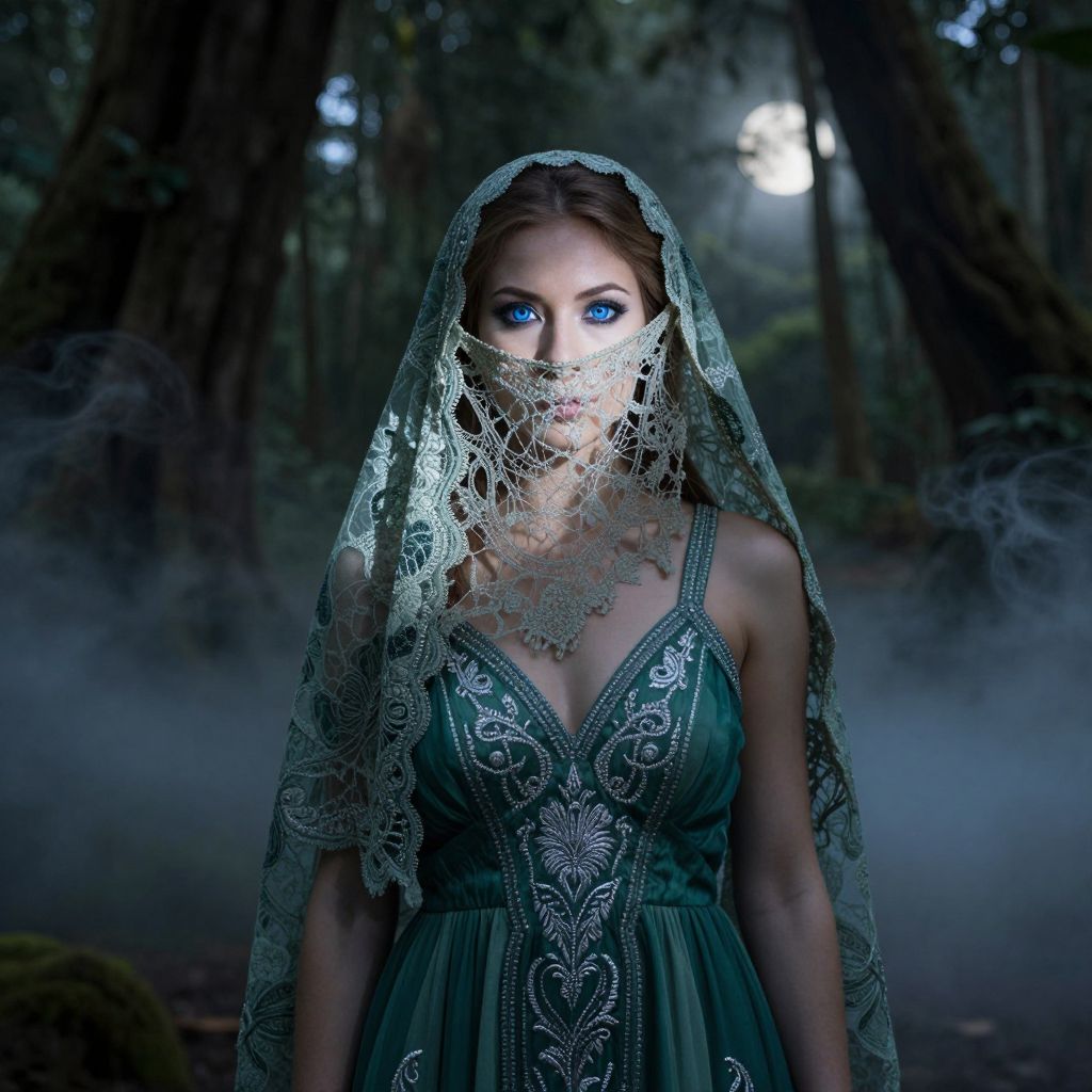 Envision a portrait of an enigmatic Pacific Islander woman with piercing blue eyes and an air of mystery, her porcelain skin bathed in soft moonlight that casts dramatic shadows. She stands amidst an ancient forest's tranquility, ethereal mist swirling around her flowing emerald gown adorned with intricate silver embroidery. From an 'insect's-eye view', focus on the interplay of light and shadow highlighting the resilient lace veil across her face, revealing only her captivating gaze. This surreal yet timeless portrait exudes fairy tale allure, inviting viewers to embark on a journey into the enchanting world of this mysterious subject.