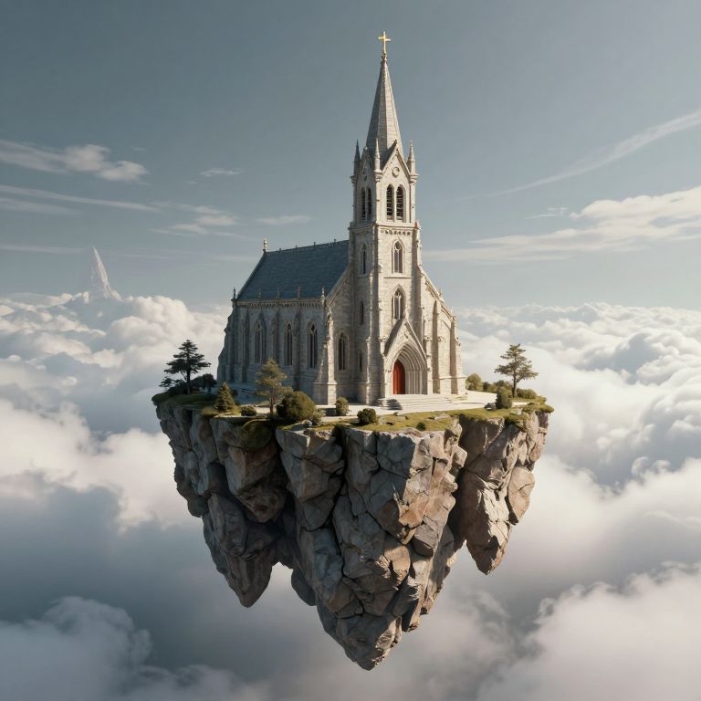 A surreal 3D-rendered vision depicts a floating stone church perched atop a jagged cliff, surrounded by ethereal clouds, blending architectural grandeur with otherworldly fantasy in a high-definition, computer-generated scene where gravity-defying structures evoke timeless mystery.