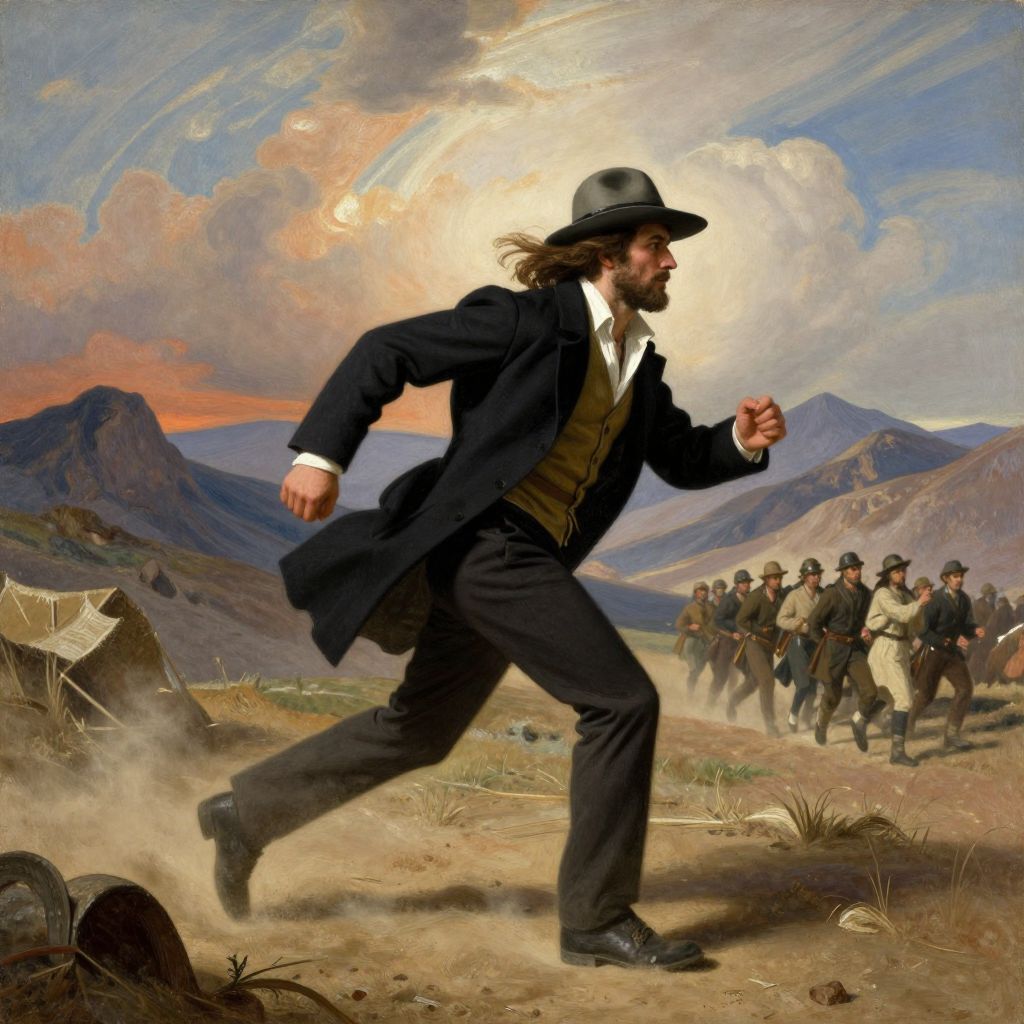 Digital illustration of a bearded man in 19th-century attire, running with determination in a dusty desert landscape, pursued by a group of soldiers under