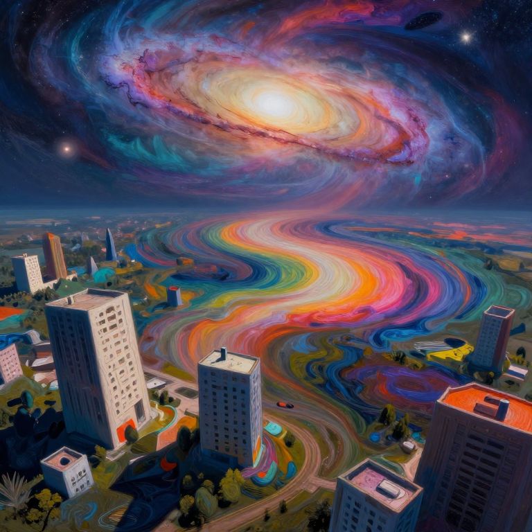 A dreamlike panorama emerges as swirling galaxies of hue entwine with deformed architectural structures, eliciting sensations of awe and contemplation from an unconventional aerial viewpoint. Vivid shades pirouette beneath an otherworldly sky, reminiscent of post-impressionist strokes, while the composition preserves illogical yet captivating imagery that dissolves the boundaries between reality and fantasy. This enchanting landscape merges elements of surrealism with vibrant palettes to craft a spellbinding vista that defies conventional perceptions of space and time.