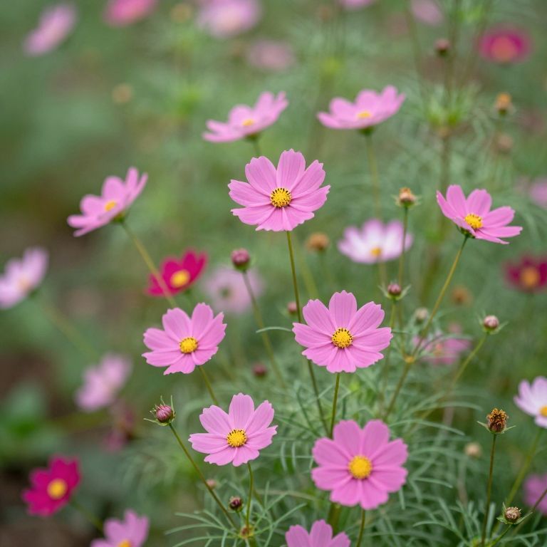 Vibrant pink cosmos flowers bloom abundantly against a muted green backdrop, their delicate petals and golden centers contrasting beautifully with lush green stems and foliage in a natural, garden-like setting.