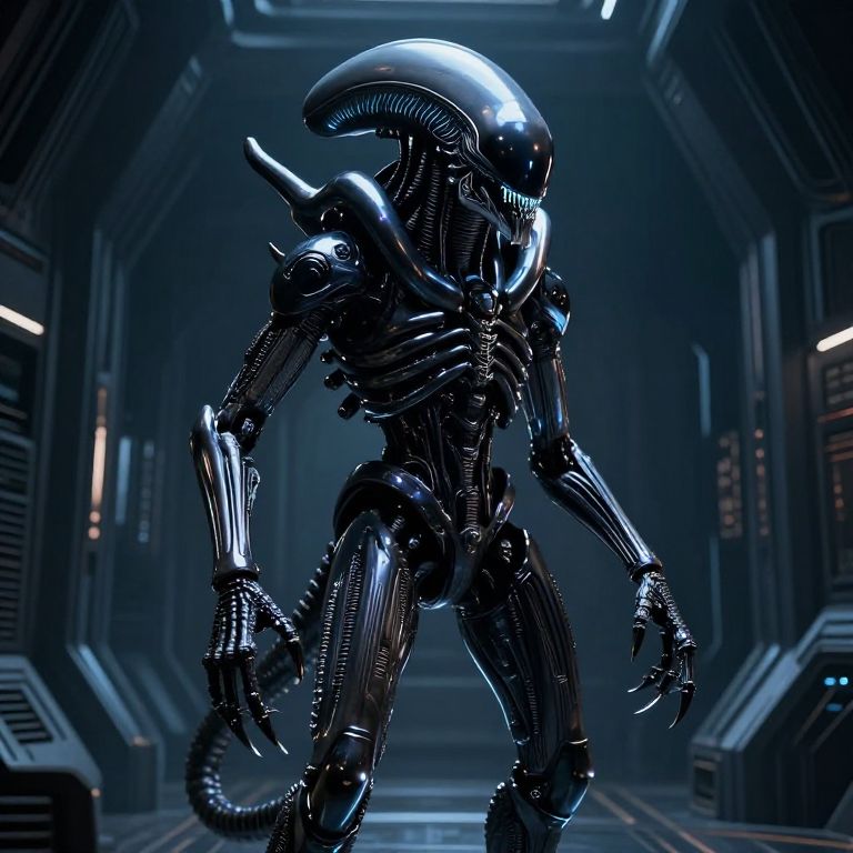 Digital CGI image of a glossy, black, biomechanical alien creature from the "Alien" franchise. The creature stands in a dark, futuristic corridor with blue lighting, showcasing its sleek, ribbed exoskeleton and elongated, smooth head with a prominent dorsal ridge. Its elongated, muscular arms end in sharp claws, and a long, curved tail is visible. The background features metallic walls with illuminated panels, enhancing the sci-fi atmosphere. The creature's reflective surface glimmers under the blue light, emphasizing its menacing and futuristic design. The overall style is highly detailed and realistic.