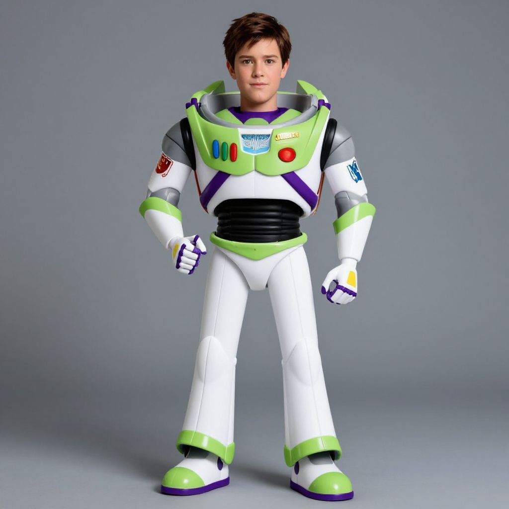"male buzz light year costume, male focus, 1boy, looking at viewer, solo focus, smile, blurry, science fiction, power armor, armor, black hair, realistic, blurry background Realistic photo of casual sexy person with pretty face"