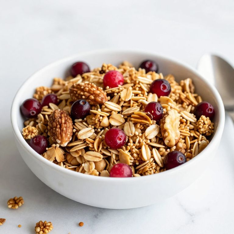 Hearty Christmas Pudding Granola, featuring golden clusters of oats and nuts interspersed with vibrant red cranberries, is artfully presented in a white bowl, accompanied by a spoon and scattered crumbs on a clean marble surface.
