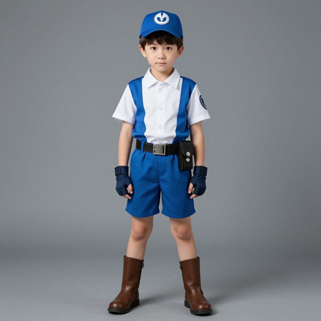 "child yellow mustard costume, male focus, solo, 1boy, standing, hat, belt, looking at viewer, black hair, full body, brown footwear, long sleeves, boots, closed mouth Realistic photo of casual sexy person with pretty face"