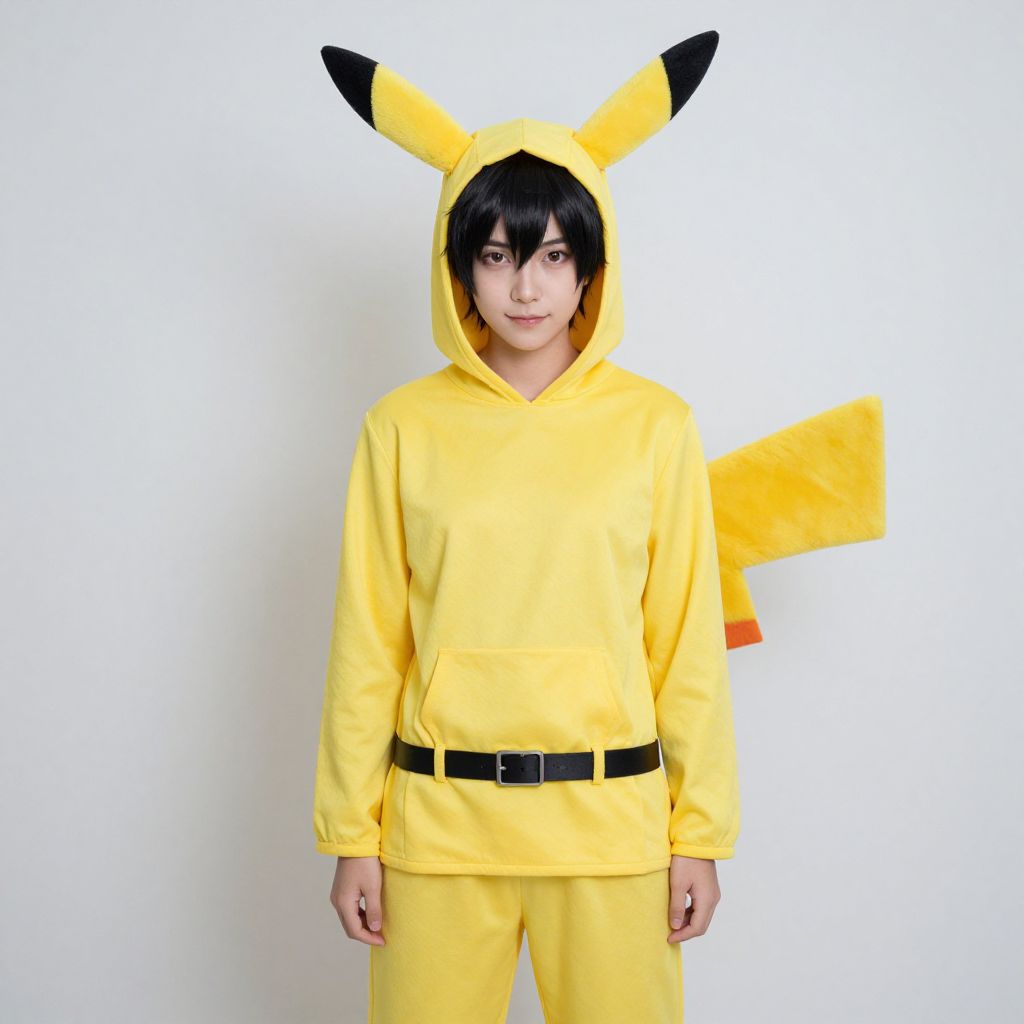Photograph of an East Asian boy, around 5-7 years old, standing against a plain beige wall with a dark brown baseboard. He wears a bright yellow, long-sleeve onesie with a matching yellow hat that has two small, pointed ears. His outfit is accessorized with a black belt and brown leather boots. The boy has short black hair and a neutral expression. The floor is tiled in a light beige color, contrasting with the dark brown baseboard. The overall lighting is even, highlighting the vibrant yellow of his costume.