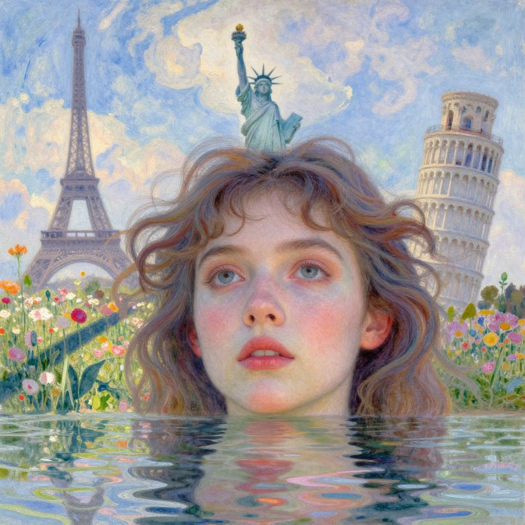 A surreal portrait depicting a close-up 'bug's-eye view' of a young woman with intricate, flowing hair reminiscent of watercolor brushstrokes, seamlessly blending into a landscape of vibrant flora and fauna. The scene is captured from a low perspective, looking up at her face that mirrors a serene lake with ripples of color reflecting her thoughtful expression, evoking the tranquility often found in Monet's works. The ethereal sky features clouds shaped like iconic landmarks – an Eiffel Tower silhouette, a Statue of Liberty outline, and the Leaning Tower of Pisa – casting long shadows across fields of soft, luminescent flowers, fostering a sense of wonder as we contemplate the interconnectivity of our world amidst this surrealistic tableau.