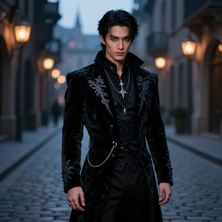 A photograph of a young, attractive man with pale skin and dark, tousled hair standing in a dimly lit, cobblestone alley at dusk. He wears a long, black velvet coat adorned with intricate silver embroidery and a silver cross necklace. He has several silver rings on his fingers and a chain hanging from his waistcoat pocket. His intense gaze is directed at the camera. Warm, blurry street lamps line the alley, creating a bokeh effect in the background. The overall mood is mysterious and gothic, with a focus on the man's striking, dark attire and piercing eyes.