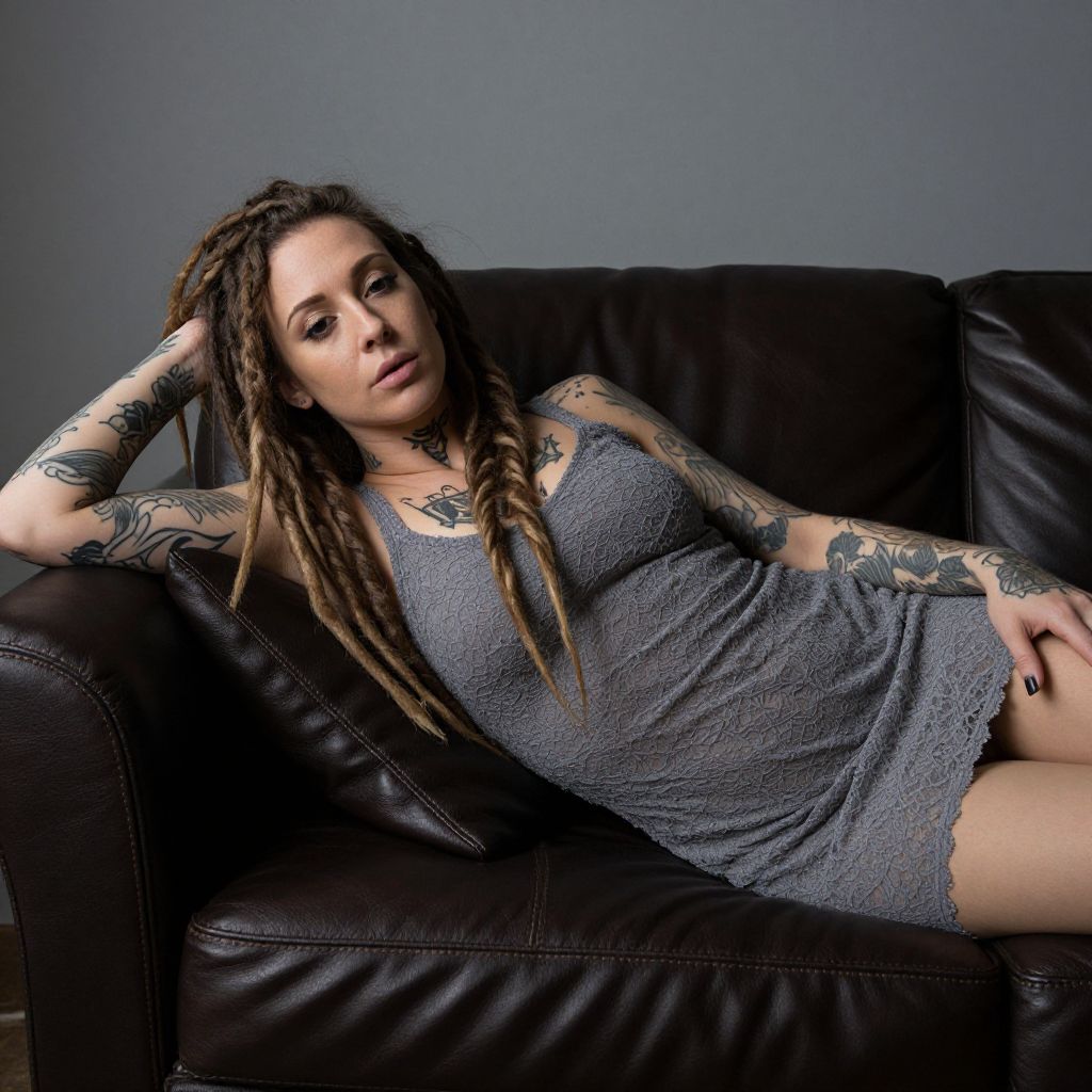 Photograph of a tattooed woman with long, dreadlocked hair, reclining on a dark brown leather couch. She's wearing a textured, grey lace dress and has a relaxed, slightly seductive expression. Her arms, adorned with intricate tattoos, rest casually on the couch. The background is a plain, grey wall, adding to the moody, intimate atmosphere. The lighting is soft, highlighting her features and the texture of her dress.