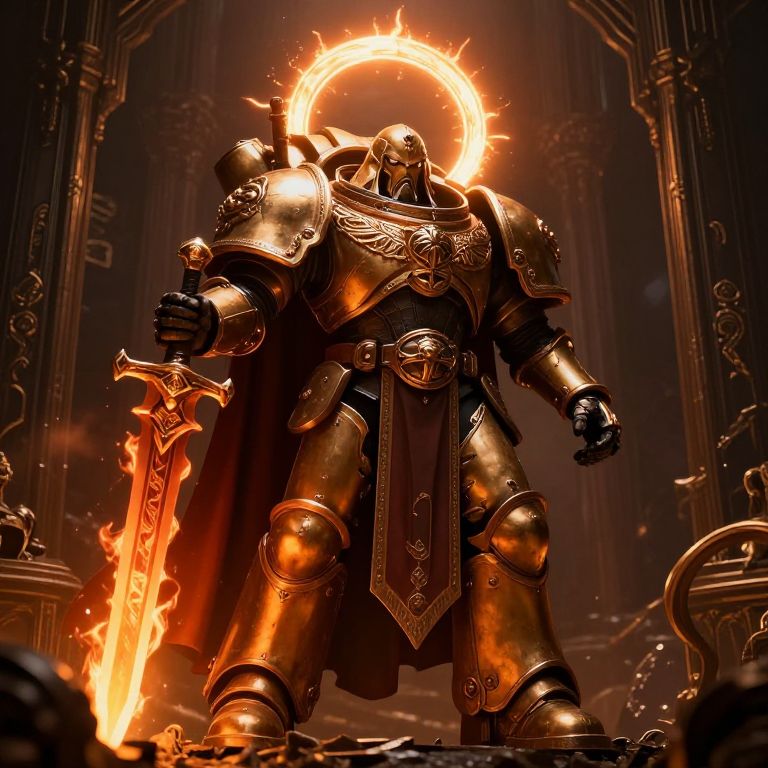 Wh40k god emperor in majestic armor, holding a flaming sword, halo of light behind him, ancient grimdark sci-fi environment, intricate details, powerful and divine atmosphere