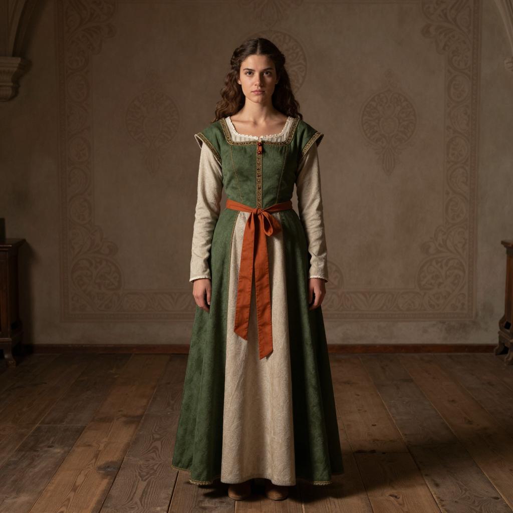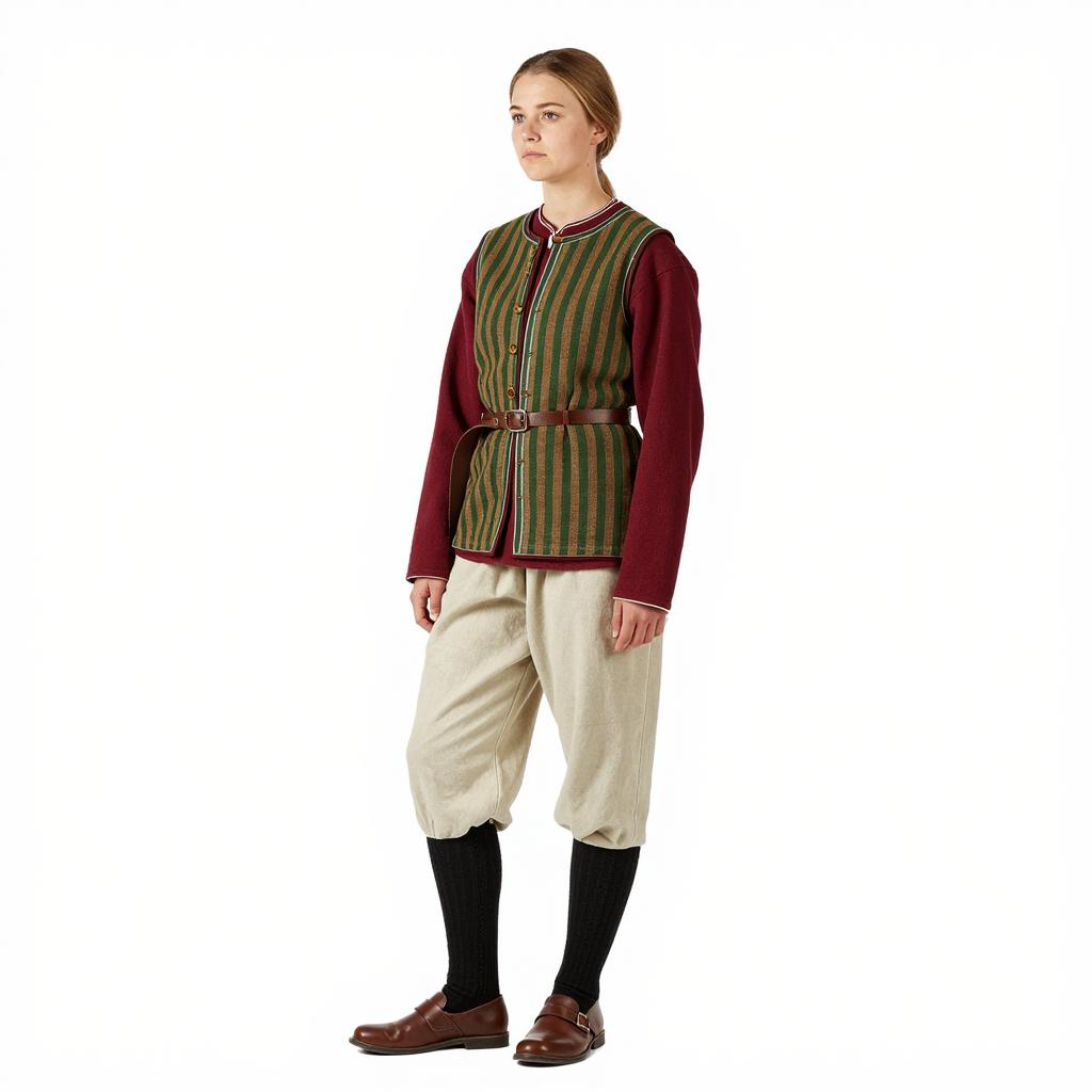 Traditional danish folk, photograph of a young woman, standing, white background, full body, casual medieval or folk attire, long-sleeve dark red shirt, green and brown striped vest with brown belt, beige knee-length pants, black knee-high socks, brown leather shoes, light brown hair tied back, neutral expression, slight side view, minimalist background, realistic style